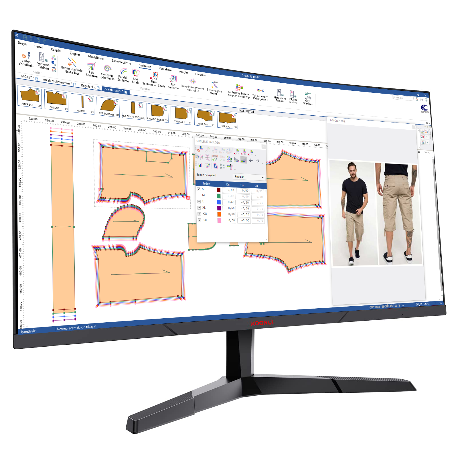 Pens açma, çizgi kopyalama, paralel hat çizme, helezon volan oluşturma gibi işlemler; çıt, drill, delgi, referans çizgileri ve iç şekiller gibi tüm nesnelerin ayrı ayrı yönetilebilmesi sayesinde, kalıp tasarımında tam bir özgürlük sunuyor. Üstelik, oluşturulan kalıpların tüm kumaşlara en verimli şekilde yerleştirilebilmesi, "Crea Extreme" sistemiyle artık çok daha kolay!